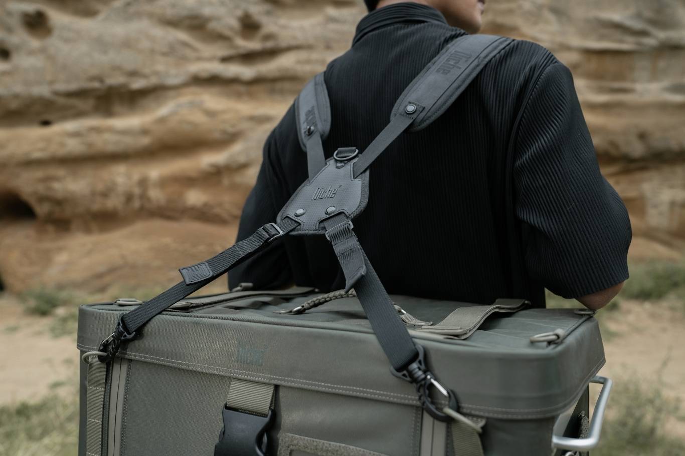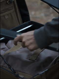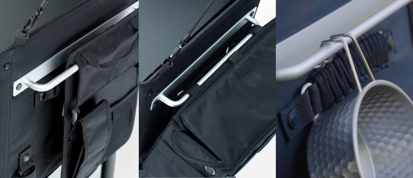 山海任務兩側設計了銀色提把,讓配件能夠向外擴充收納空間,以【方盒模組】及【收納掛板】本身的扣帶直接固定,亦可以直接使用S型掛勾吊掛裝備。
