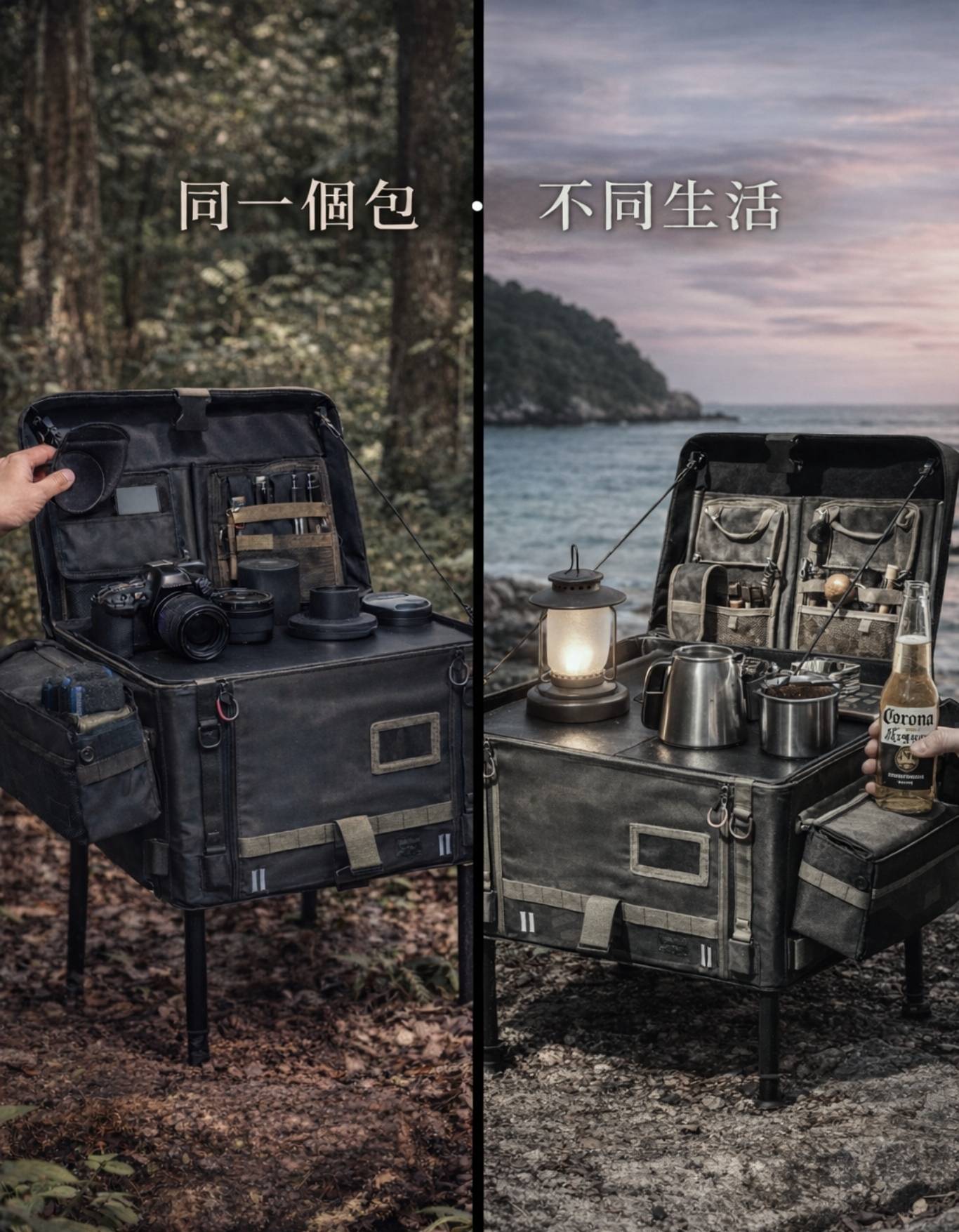 就像樂高積木一樣——可以把不同的料理工具(爐具、砧板、收納盒…)自由拼接、替換,組合成一張「專屬自己的風格戶外廚」。